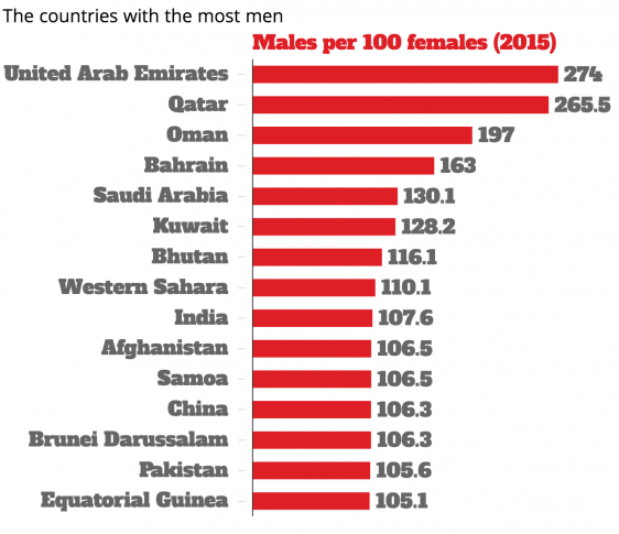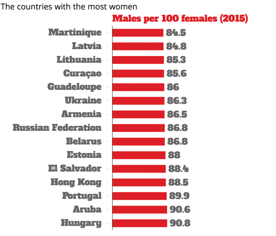 ![]() كشف تقرير هيئة الأمم المتحدة لتعداد السكان عام 2015 الخارطة الجديدة لتوزع الرجال والنساء بأعداد غير متساوية في جميع أنحاء العالم. وتم تحديد نسب التفاوت بين أعداد الرجال وأعداد النساء في كل بلد وفقا لعدة معايير من بينها النزاعات وتفاقم اختلال التوازن في ما بين الجنسين بسبب انخفاض عدد الولادات وغيرها. ويشمل التقرير قائمة بترتيب 201 دولة ومنطقة وفقا لمعدلات تفاوت أعداد الجنسين في كل منها، واستندت الإحصاءات على عدد الذكور مقابل كل 100 أنثى. وفقا للتقديرات تظهر الخارطة الجديدة عموما بوضوح تفاوت أعداد الرجال والنساء حول العالم حيث يفوق عدد النساء عدد الرجال في الجمهوريات السوفيتية سابقا، على سبيل المثال، وذلك لأسباب تاريخية. فخلال الحرب العالمية الثانية مات الكثير من الرجال في القتال. وفي المقابل يفوق عدد الرجال عدد النساء في آسيا والدول العربية وشمال أفريقيا. وتتصدر جزيرة المارتينيك الواقعة في شرق البحر الكاريبي قائمة البلدان التي تتفوق فيها أعداد الإناث على أعداد الذكور بمعدل 84.5 رجل لكل 100 امرأة، ثم تليها لاتفيا بمعدل 84.8 رجل لكل 100 امرأة ثم ليتوانيا بـ85.3 وتأتي بعدها جزيرة كوراساو التابعة لهولندا بـ85.6، وبعدها جزيرة الغواديلوب في المكسيك بمعدل 86 رجلا لكل 100 امرأة ثم تأتي أوكرانيا بعد ذلك بـ 86.3، تليها أرمينيا بـ 86.5 ثم روسيا الاتحادية وبيلاروسيا بمعدل 86.8، ثم إستونيا بمعدل 88، تليها جمهورية السلفادور بـ 88.4 ثم هونغ كونغ بمعدل 88.5 والبرتغال بـ 89.9 تليها جزيرة أروبا بـ 90.6 وهنغاريا بمعدل 90.8 رجل لكل 100 امرأة. في المقابل تحظى دول أخرى بعدد ذكور يفوق عدد الإناث وهي الإمارات العربية المتحدة بمعدل 274 رجلا لكل 100 امرأة، تليها قطر بـ 265.5، ثم عمان بـ 197 والبحرين بـ 163 والمملكة العربية السعودية بـ130.1، والكويت بـ128.2 ثم بوتان بمعدل 116.1، تليها الهند بـ 107.6 رجال لكل 100 امرأة. المصدر: "انديبندنت"