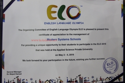 ![]() فاز فريقا مدارس النظم الحديثة الثانوية /ذكور بجائزتين في أولمبياد اللغة الإنجليزية الدولية 2019 ELO التي أقيمت في جامعة العلوم التطبيقة تحت عنوان Clean Energy . وقد حصل الفريق الأول على المركز الأول في مسابقة أفضل أداء مسرحي (First Place Theatrical Performance)