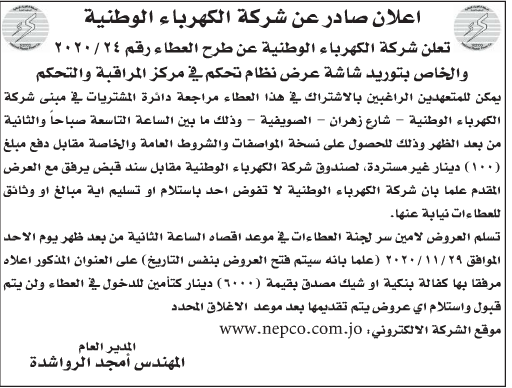 مطلوب توريد شاشة عرض لشركة الكهرباء الوطنية