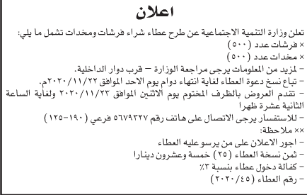 مطلوب شراء فرشات ومخدات لوزارة التنمية الاجتماعية