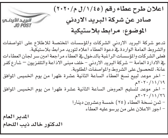 عطاء صادر عن شركة البريد الاردني