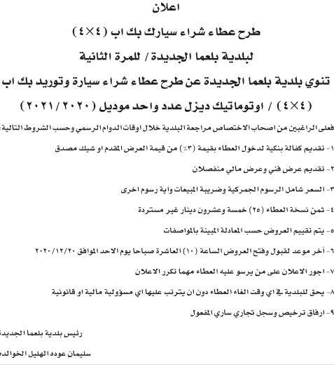 مطلوب شراء بكب دبل كابين(4×4) لبلدية بلعما