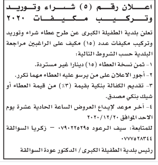 مطلوب تركيب مكيفات لبلدية الطفيلة
