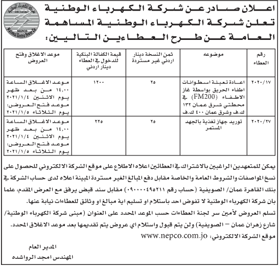 عطاءات صادرة عن شركة الكهرباء الوطنية