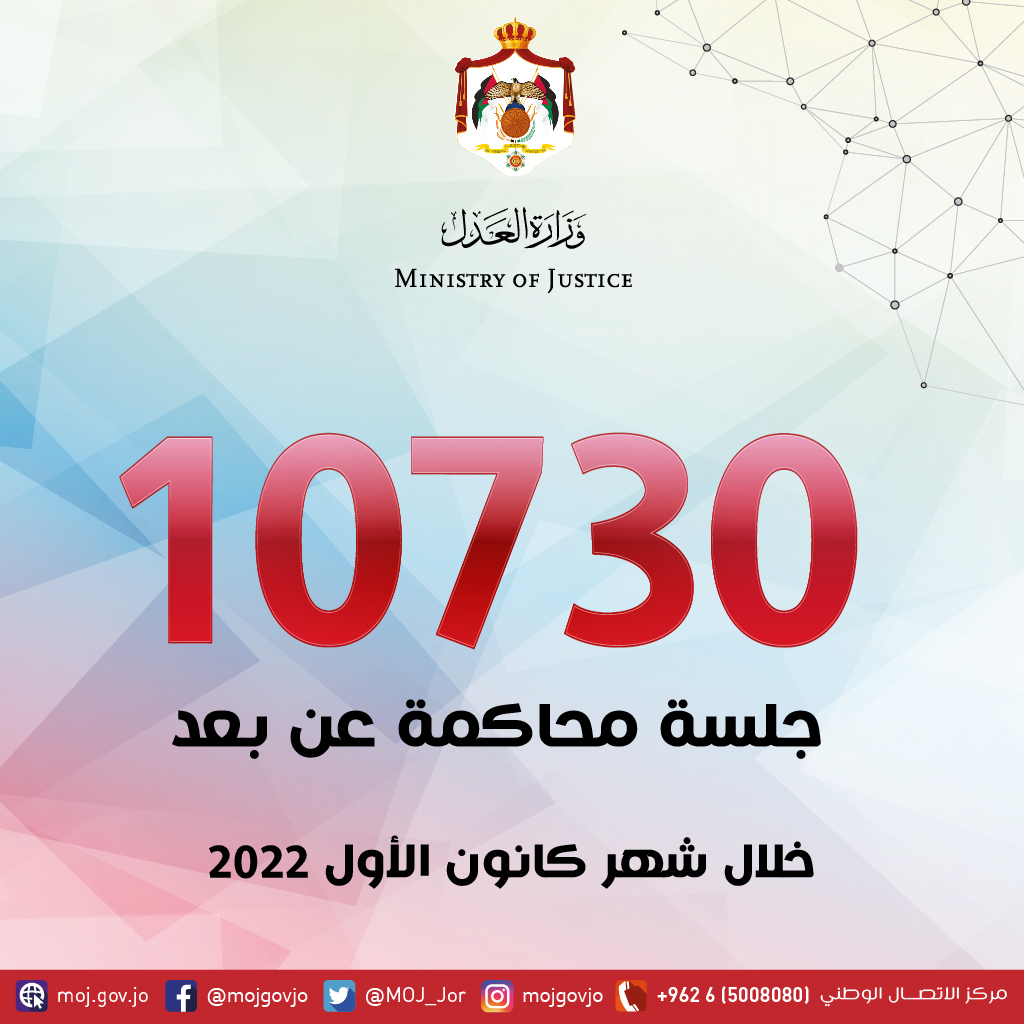 نشرت وزارة العدل أرقام احصائية حول عدد جلسات المحاكمة عن بعد والتي بلغت 10730 جلسة خلال شهر كانون أول الماضي.