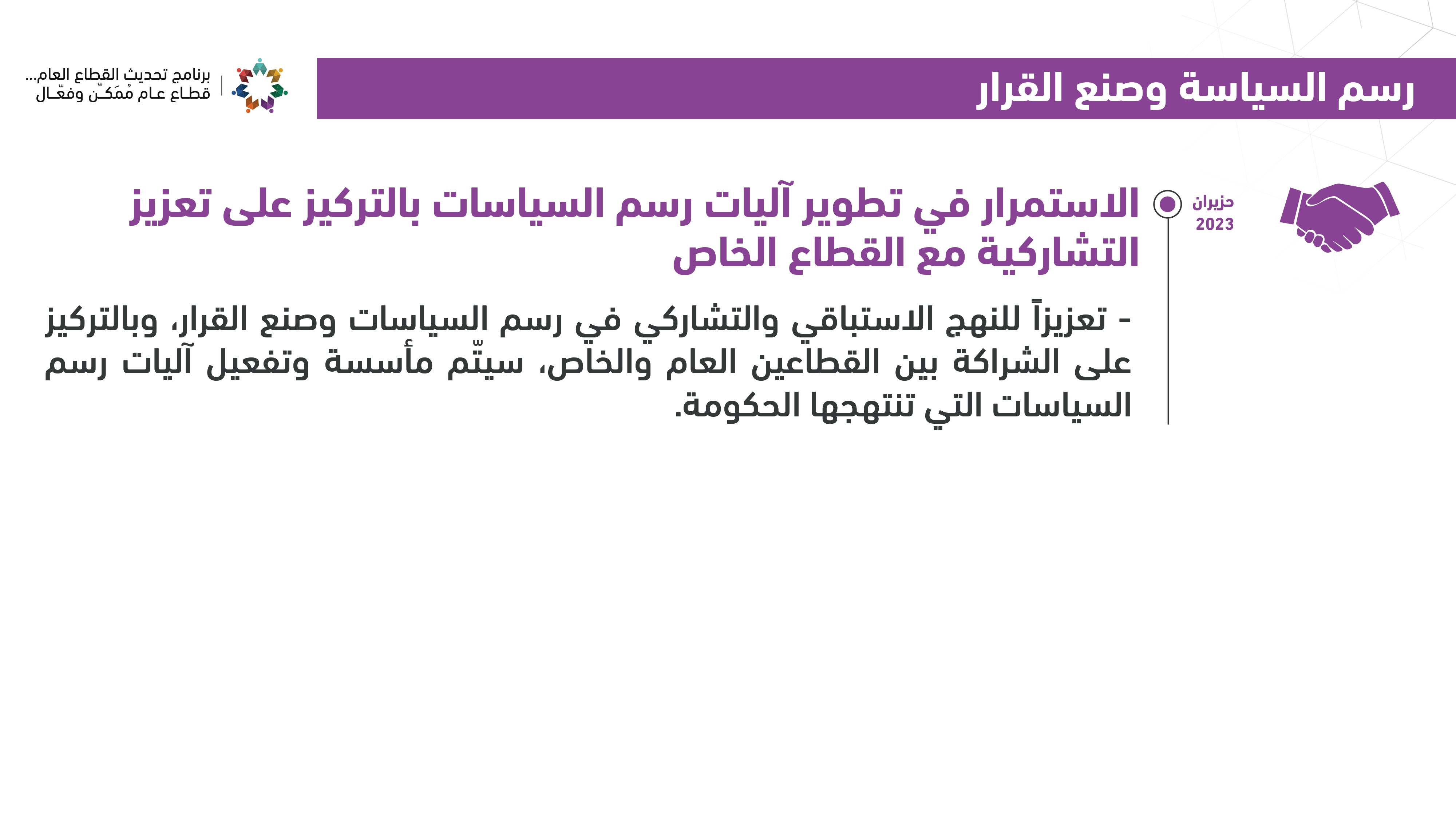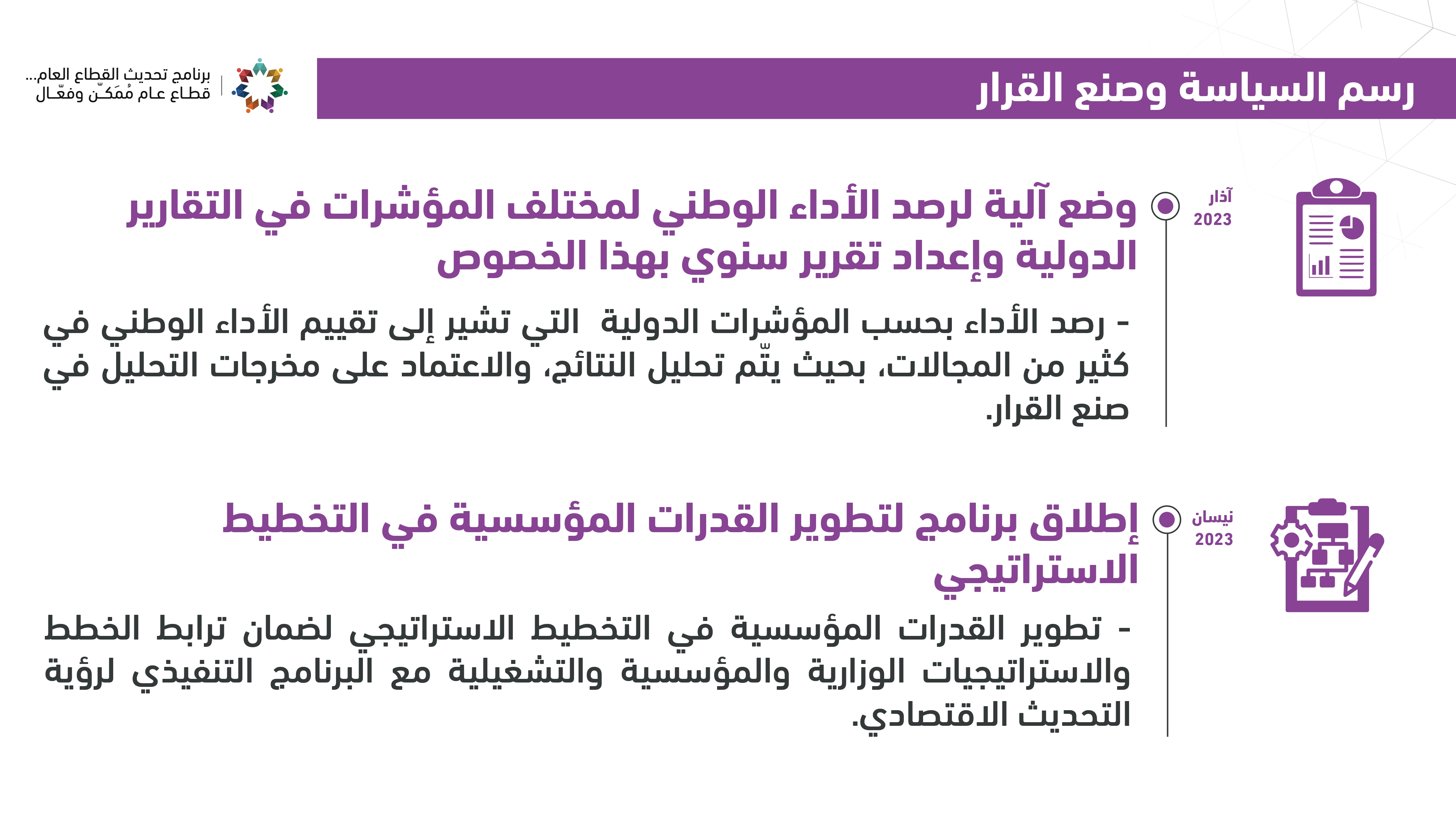 وفيما يتعلق بالمحور المؤسسي وتحديداً مكوّن رسم السياسة وصنع القرار، لفت الشريدة إلى أنه سيجري إطلاق دليل إرشادي لسياسات تقييم الأثر بالتعاون مع البنك الدولي، وإطلاق تعليمات إدارة الأداء المؤسسي، وإطلاق برنامج لتطوير القدرات المؤسسية في مجال التخطيط الاستراتيجي، ومأسسة وحدة السياسات الوطنية في وزارة التخطيط والتعاون الدولي، وتطوير نظام الأداء الحكومي الموحد الذي سيتم من خلاله متابعة الأداء على المستوى المؤسسي والقطاعي والوطني من خلال نظام إلكتروني مطور، وضع آلية لرصد الأداء الوطني لمختلف المؤشرات في التقارير الدولية كمؤشر التنمية البشرية الصادر عن برنامج الامم المتحدة للتنمية وغيره، وإعداد تقرير سنوي بهذا الخصوص، إضافة إلى استكمال تطوير السياسات والتشريعات التي تعزز من التشاركية بين القطاعين العام والخاص.