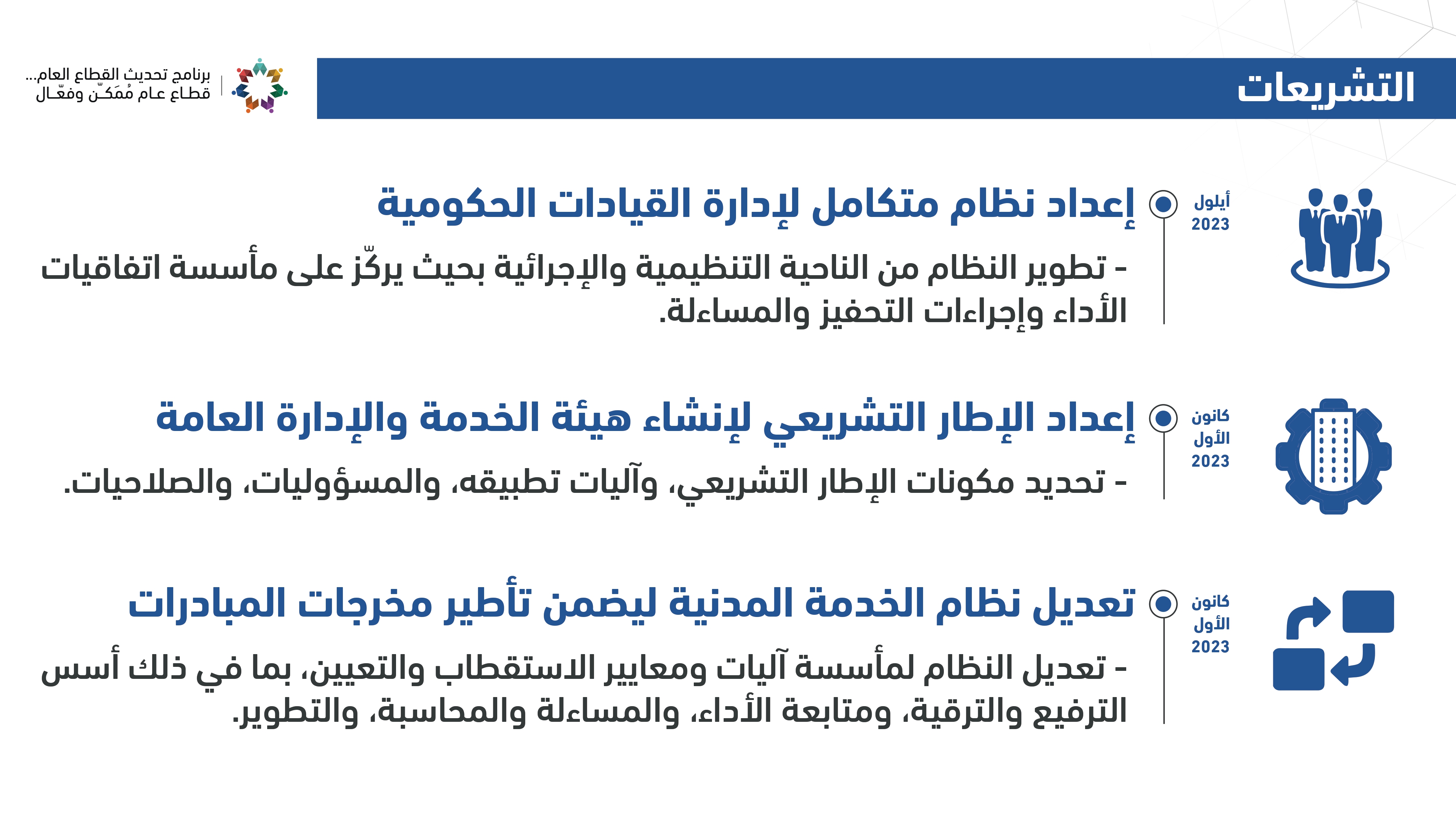 وأشار الشريدة إلى أنّ هناك أولويات في مكون التشريعات تتضمن إعداد منظومة تشريعات لتطوير الهياكل التنظيمية للمؤسسات بحيث تحافظ على الثبات التشريعي والإداري لها وتتجنب التغيير المستمر، وإقرار نظامٍ متكاملٍ لإدارة القيادات الحكومية من حيث طريقة التعيين والترفيع والتخطيط لبناء قيادات إدارية متعاقبة، إضافة إلى إعداد الإطار التشريعي لإنشاء هيئة الخدمة والإدارة العامة.