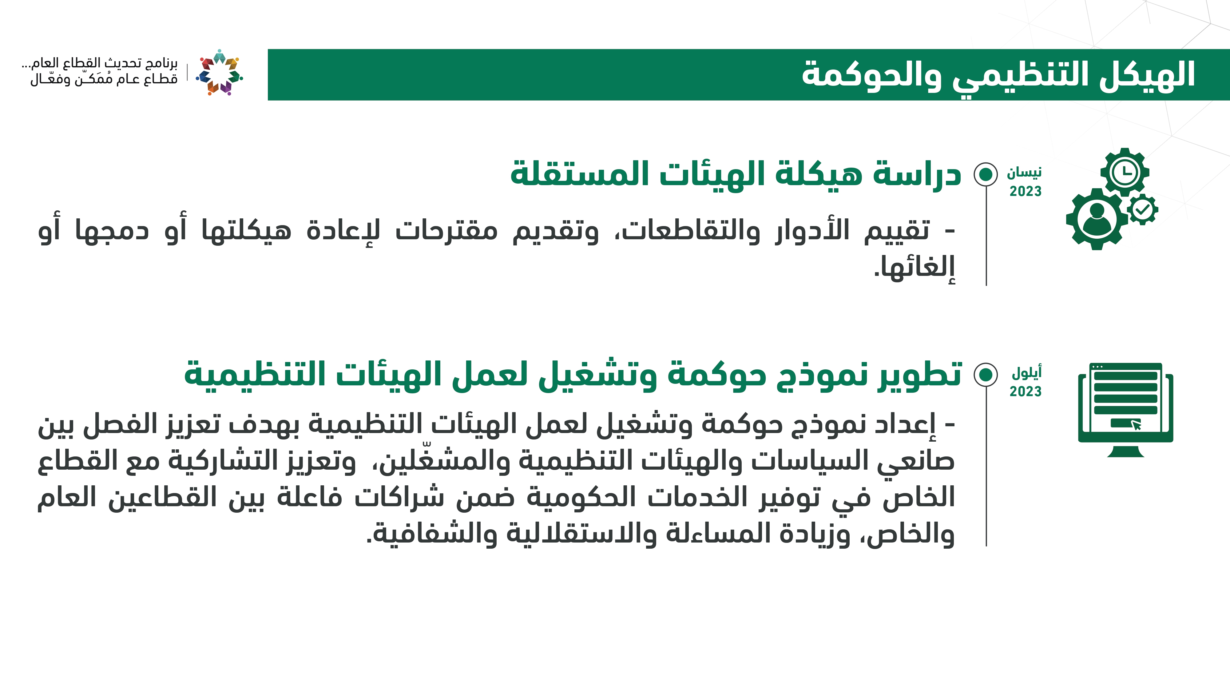 وقال الشريدة: بهدف تعزيز الفصل بين صانعي السياسات والهيئات المستقلة والمشغّلين، وتعزيز التشاركية مع القطاع الخاص في توفير الخدمات الحكومية، سيكون هناك تطبيق لنموذج حوكمة وتشغيل عمل الهيئات التنظيمية والمستقلة، وسيبدأ تطبيقها على قطاع الطاقة.