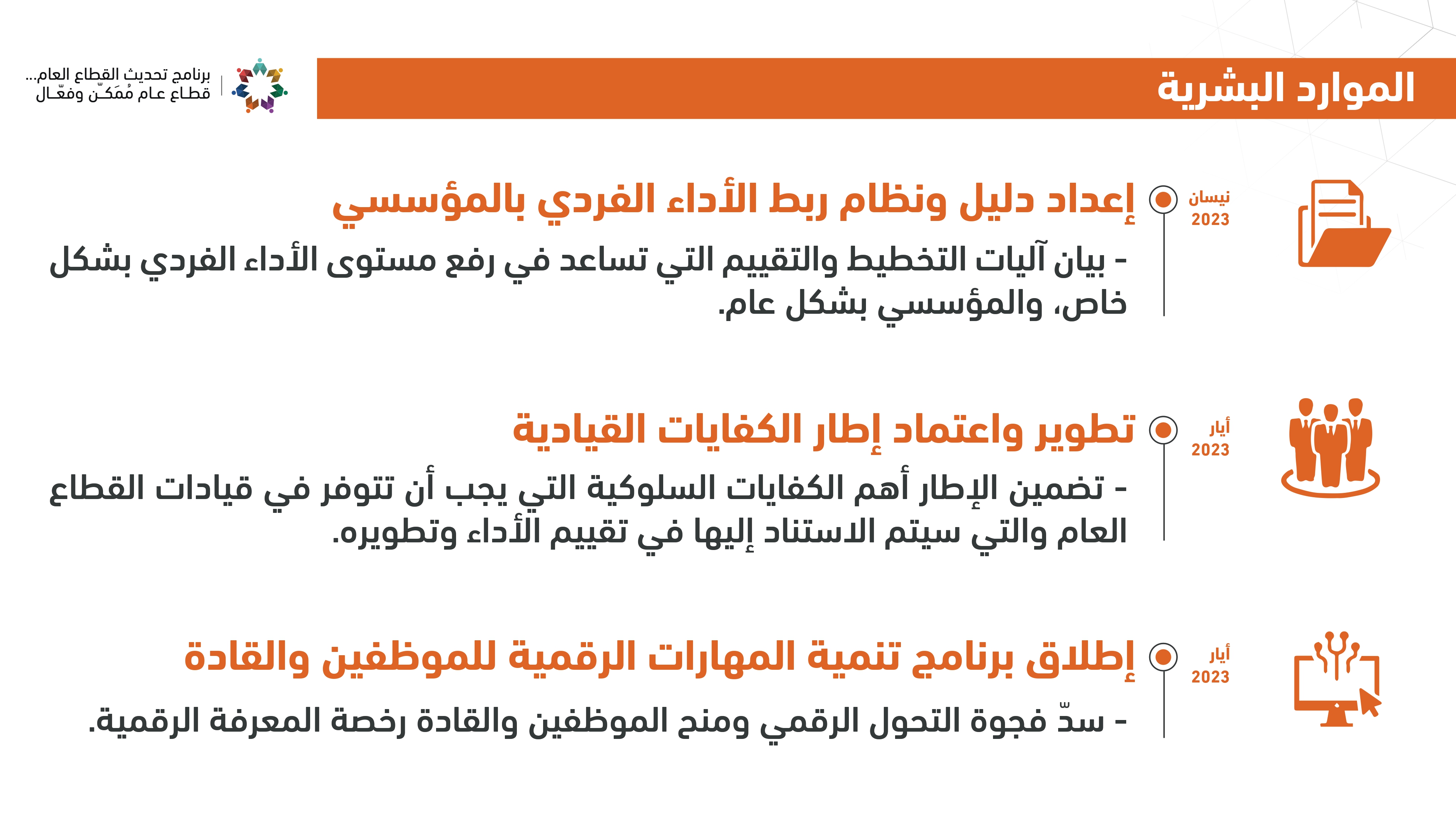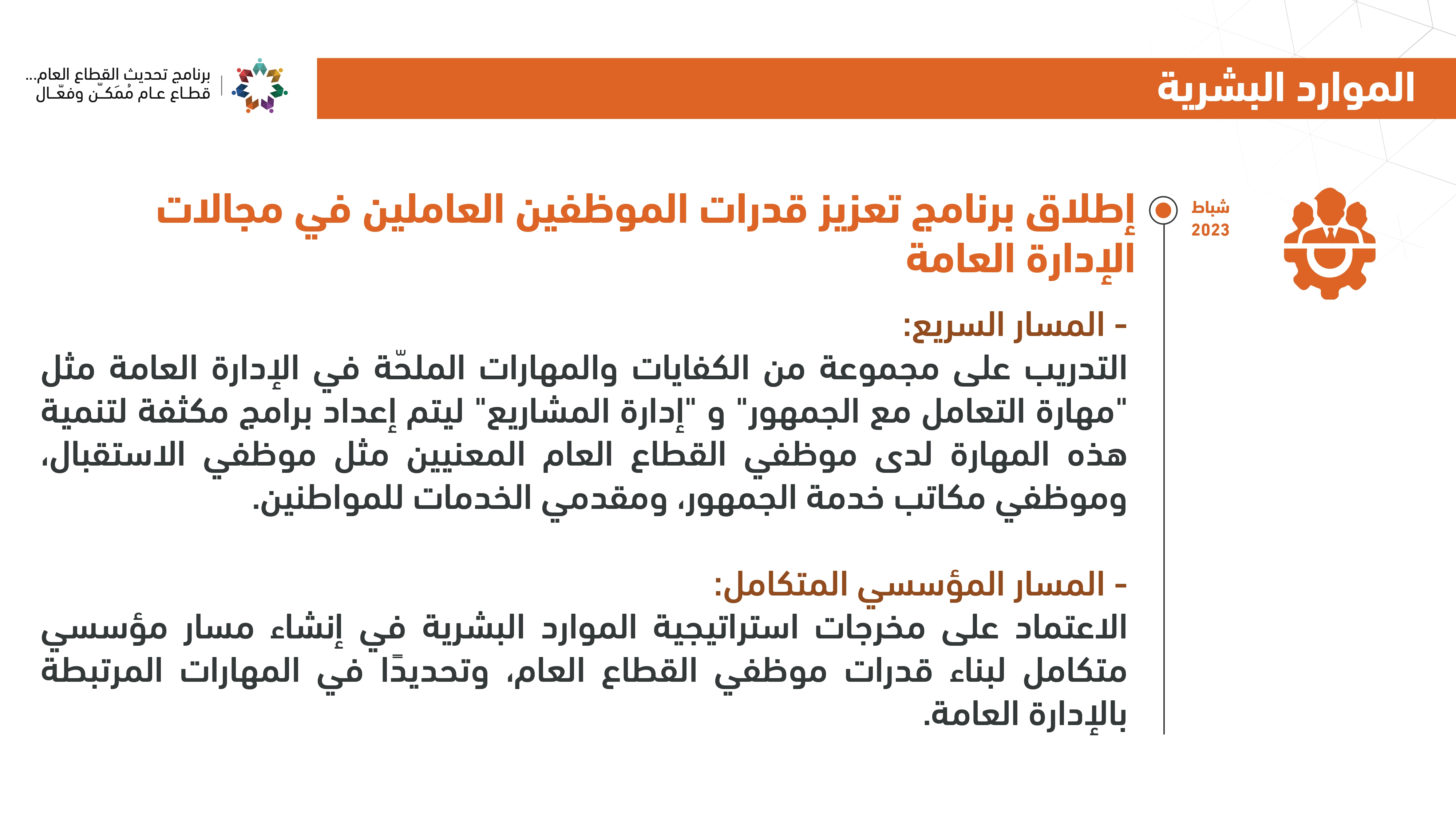 وبيّن وزير الدولة لتحديث القطاع العام أنّ الحكومة ستطلق برنامجاً تدريبياً لتعزيز قدرات الموظفين العاملين في مجالات الإدارة العامة، إلى جانب تطوير برنامج ابتعاث تخصصيّ متقدم، وإطلاق برامج لتأهيل القيادات الحكومية، وتنمية المهارات الرقميّة للموظفين والقيادات لدعم بيئة التحول الرقمي.