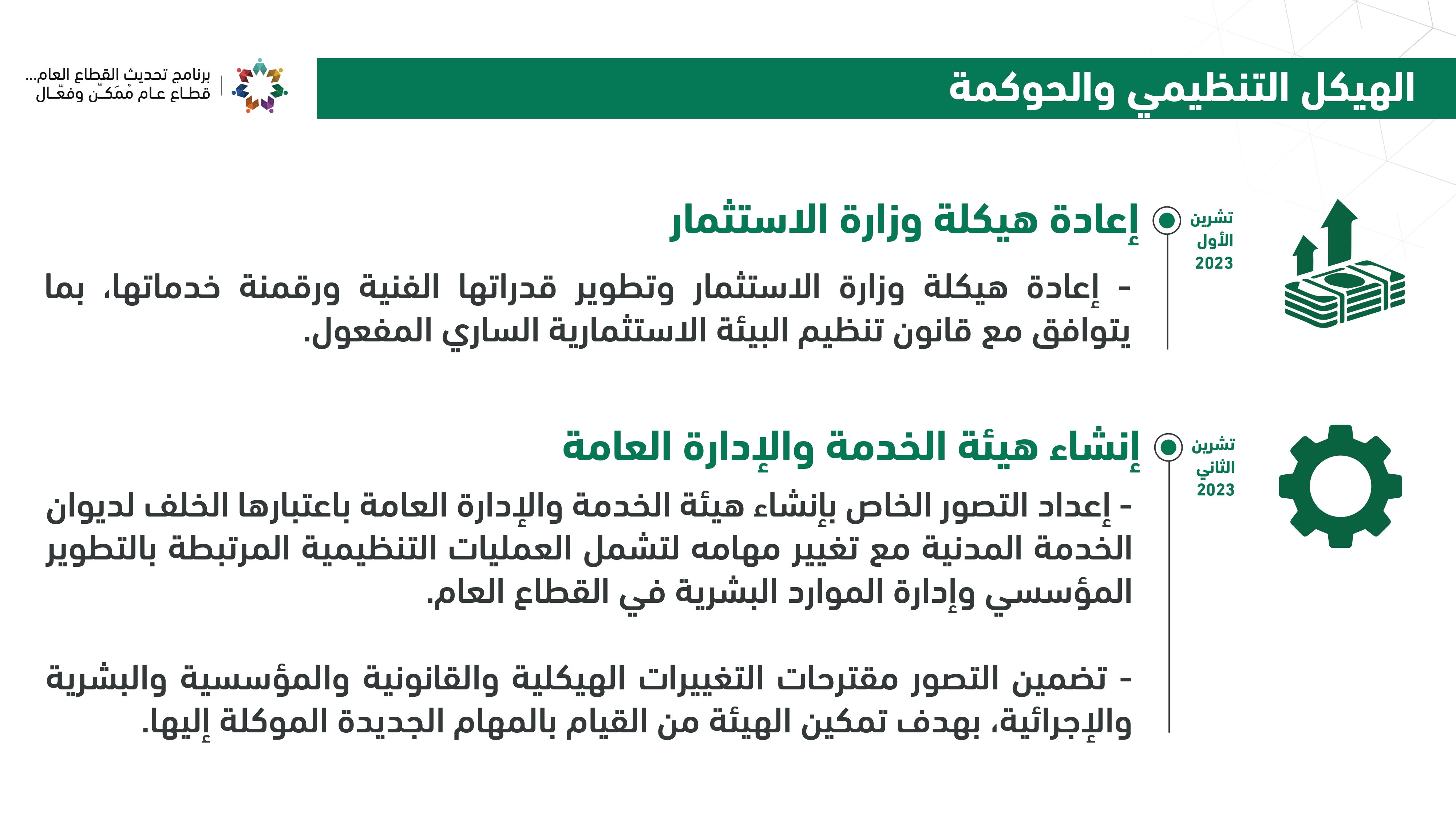 كما سيجري وفق الشريدة، إعادة هيكلة وزارة الاستثمار وتطوير قدراتها الفنية ورقمنة خدماتها بما يتوافق مع قانون تنظيم البيئة الاستثمارية الجديد، وإنشاء هيئة الخدمة والإدارة العامة باعتبارها الخلف لديوان الخدمة المدنية مع تغيير مهامه لتشمل العمليات التنظيمية المرتبطة بالتطوير المؤسسي وإدارة الموارد البشرية في القطاع العام، وإعادة هيكلة المؤسسة الأردنية لتطوير المشاريع الاقتصادية لتصبح المظلّة المنظّمة لقطاع المنشآت المتوسطة والصغيرة والريادة.