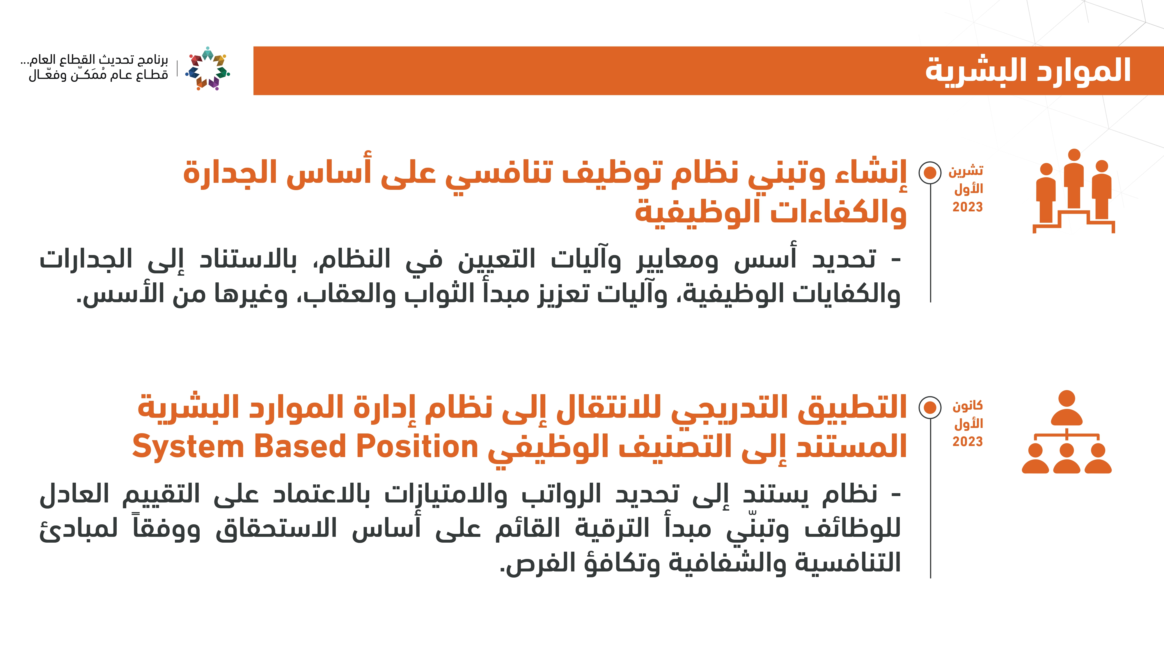 كما سيتم ضمن هذا المكوّن - وفق الشريدة- إطلاق استراتيجية للموارد البشرية تركّز على تعزيز التوجهات والممارسات العالمية في مجال إدارة الموارد البشرية، إضافة إلى التطبيق التدريجي للانتقال إلى نظام إدارة الموارد البشرية المستنِد إلى التصنيف الوظيفي، بهدف إلغاء الفجوات والتباين بين امتيازات الموظفين الماليّة والإداريّة، إلى جانب إعداد دليلٍ ونظامٍ لربط الأداء الفرديّ بالمؤسسيّ، وتطوير وتبنّي نظام لاختيار القيادات التنفيذية وللترقية والتعاقب، وإنشاء نظام للتوظيف التنافسي على أساس الجدارة والكفاءات الوظيفية، وإنشاء مركزٍ لتقييم الكفايات الحكومية.