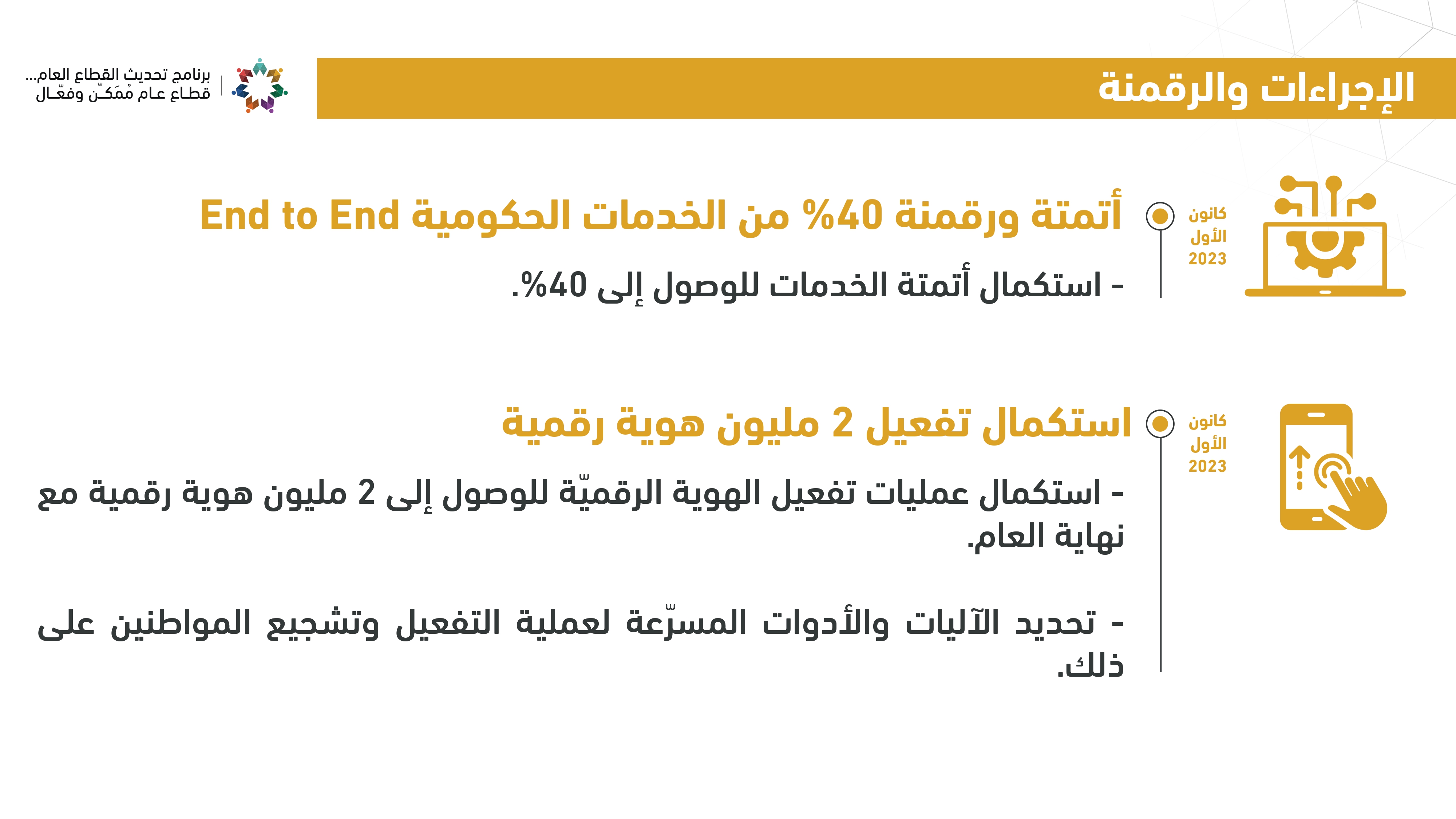 وتابع: سيجري استكمال تفعيل 2 مليون هويّة رقميّة ضمن استراتيجية التحول الرقمي، إلى جانب إنشاء السجّل الوطنيّ الموحّد للخدمات الإلكترونية الذي يربط بين المؤسسات الحكومية بهدف تقديم خدمات متكاملة للمواطنين سواء إلكترونية أو معلوماتية.