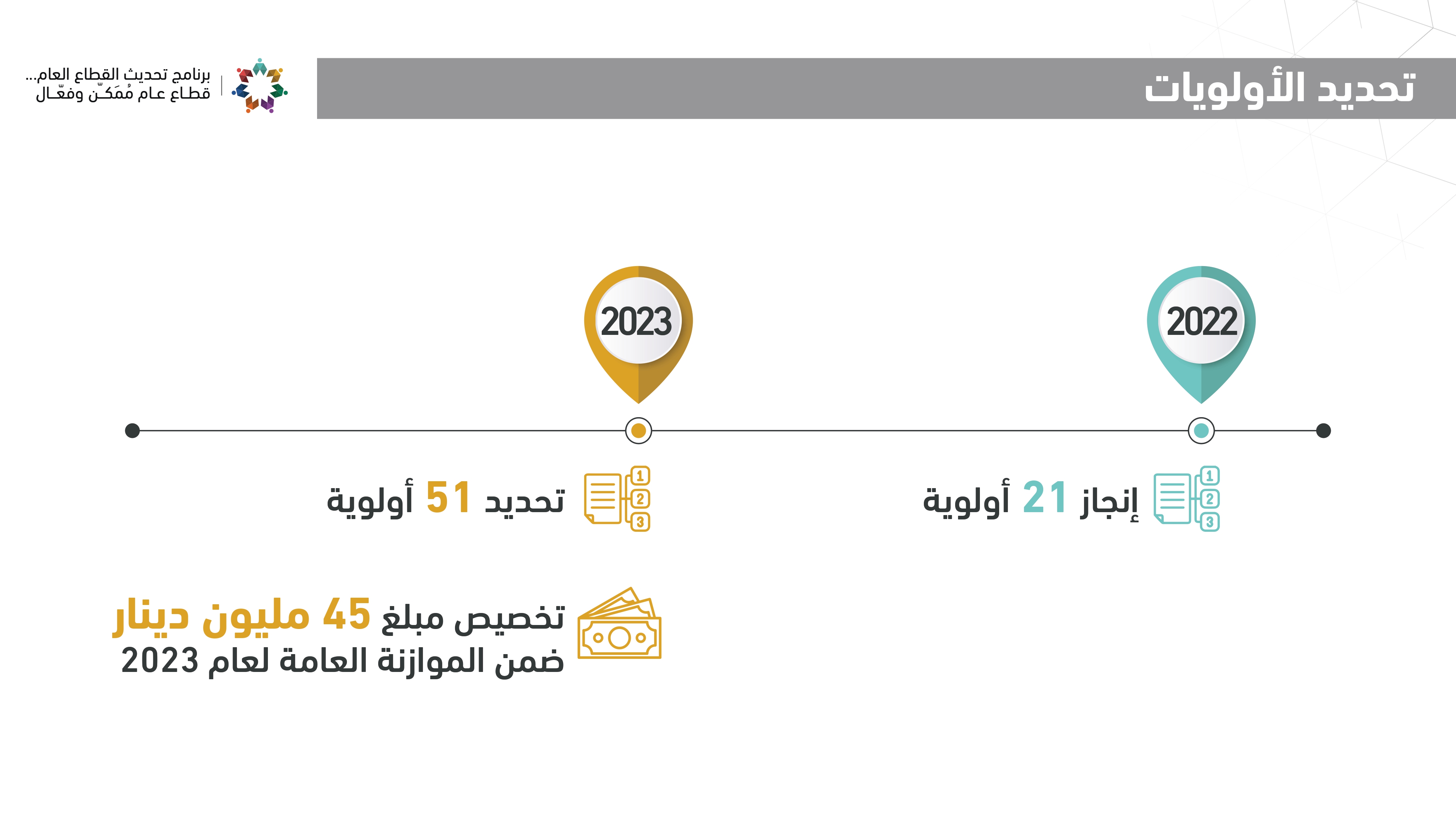 أعلن نائب رئيس الوزراء للشؤون الاقتصادية ووزير الدولة لتحديث القطاع العام ناصر الشريدة عن الأولويات والمبادرات التي ستعمل عليها الحكومة لعام 2023 ضمن البرنامج التنفيذي لخارطة طريق تحديث القطاع العام.