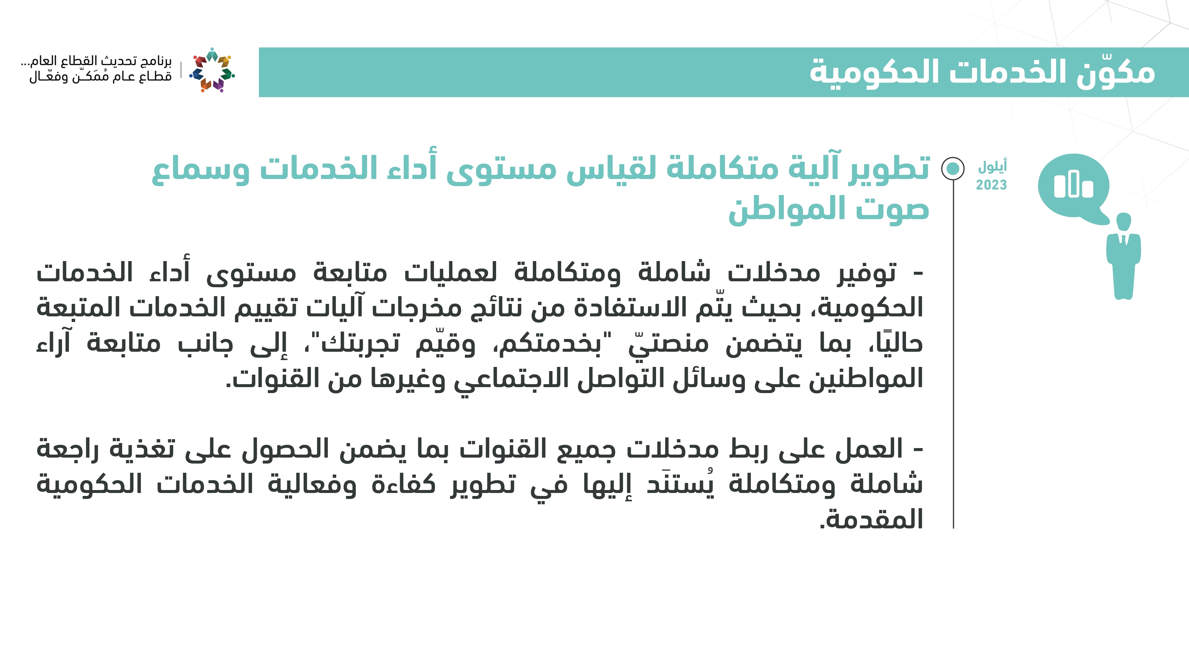 وأضاف أنه سيكون هناك آلية متكاملة لقياس مستوى أداء الخدمات المقدّمة للمواطنين، من ضمنها مراجعة الآليات المتبعة على منصتيّ بخدمتكم، وقيّم تجربتك، ورصد آراء المواطنين على وسائل التواصل الاجتماعي، بما يضمن الحصول على تغذية راجعة شاملة يُستنَد إليها في تطوير كفاءة وفعالية الخدمات الحكومية المقدّمة.