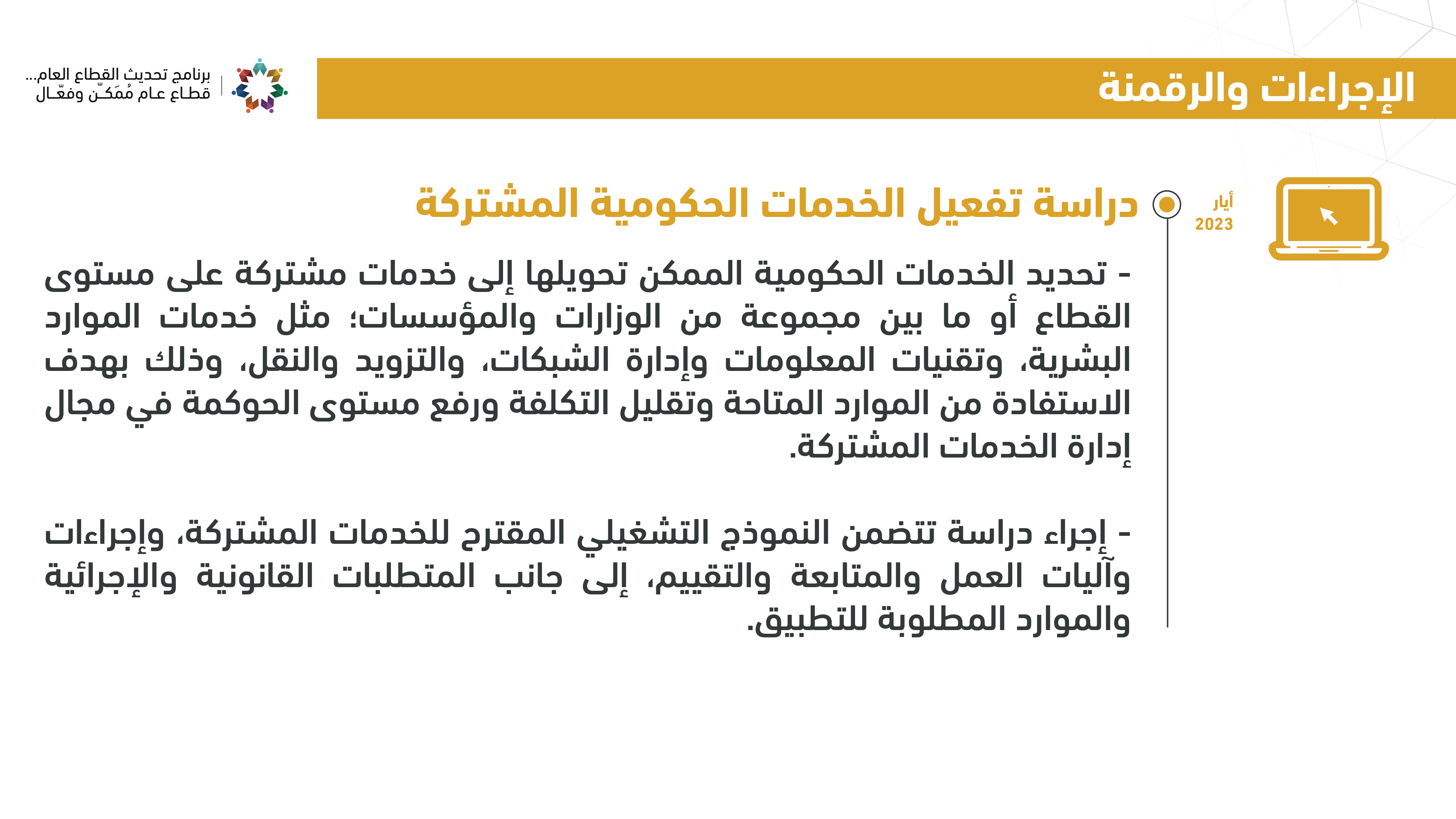 وأضاف: سيتّم تطوير نظام موحّد لإدارة الموارد الحكومية بهدف التخطيط الاستراتيجي لقطاع الخدمات، بما يضمن إدارة الموارد البشرية، والمالية بفعالية، بالإضافة إلى دراسة تفعيل مبدأ الخدمات الحكومية المشتركة على المستوى القطاعي أو ما بين مجموعة من الوزارات والمؤسسات لغايات تعزيز الاستفادة من الموارد المتاحة، وتقليل التكلفة، وصولاً إلى إقرار التشريعات والسياسات اللازمة لتفعيلها وفقاً لهذه الدراسة.