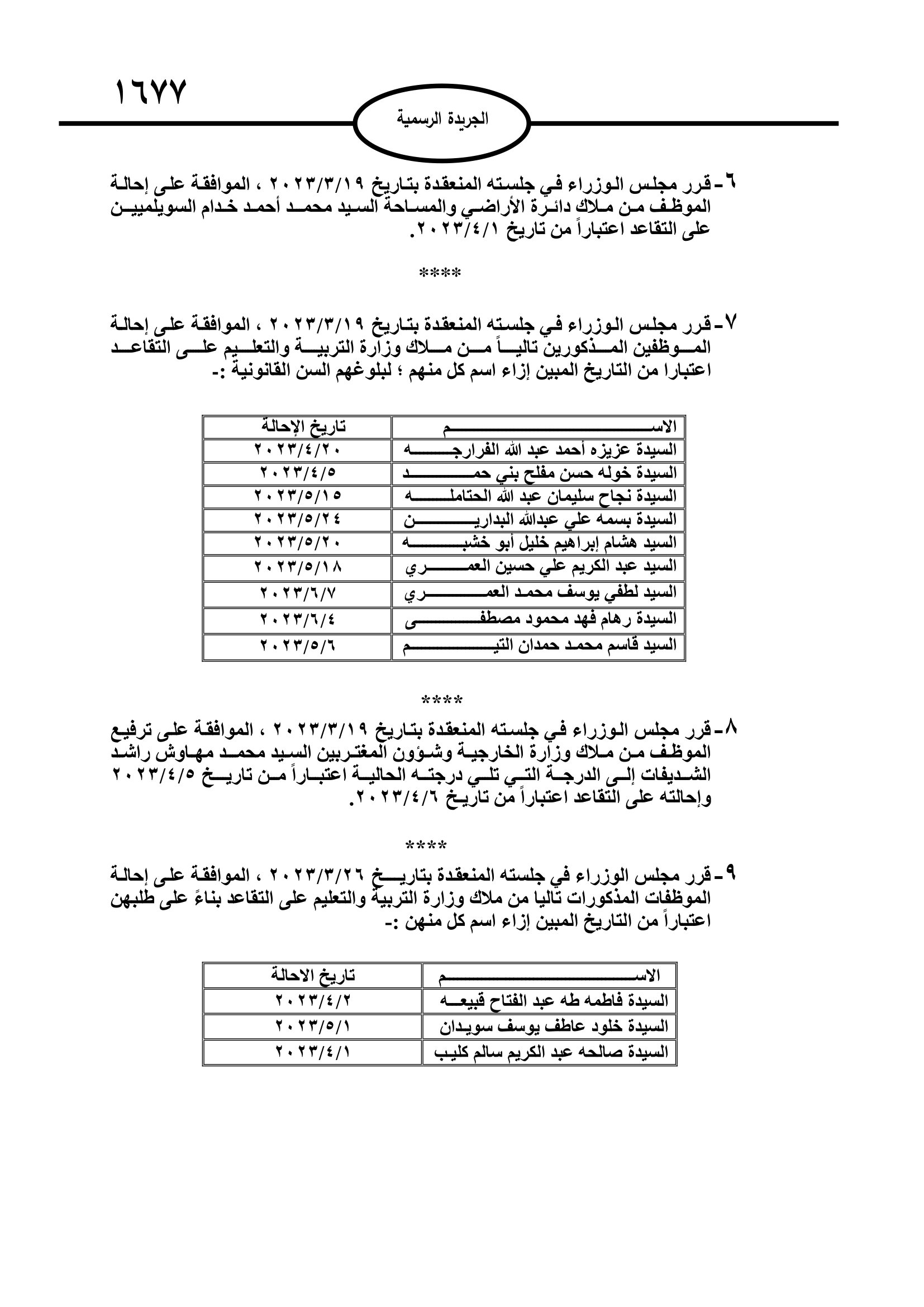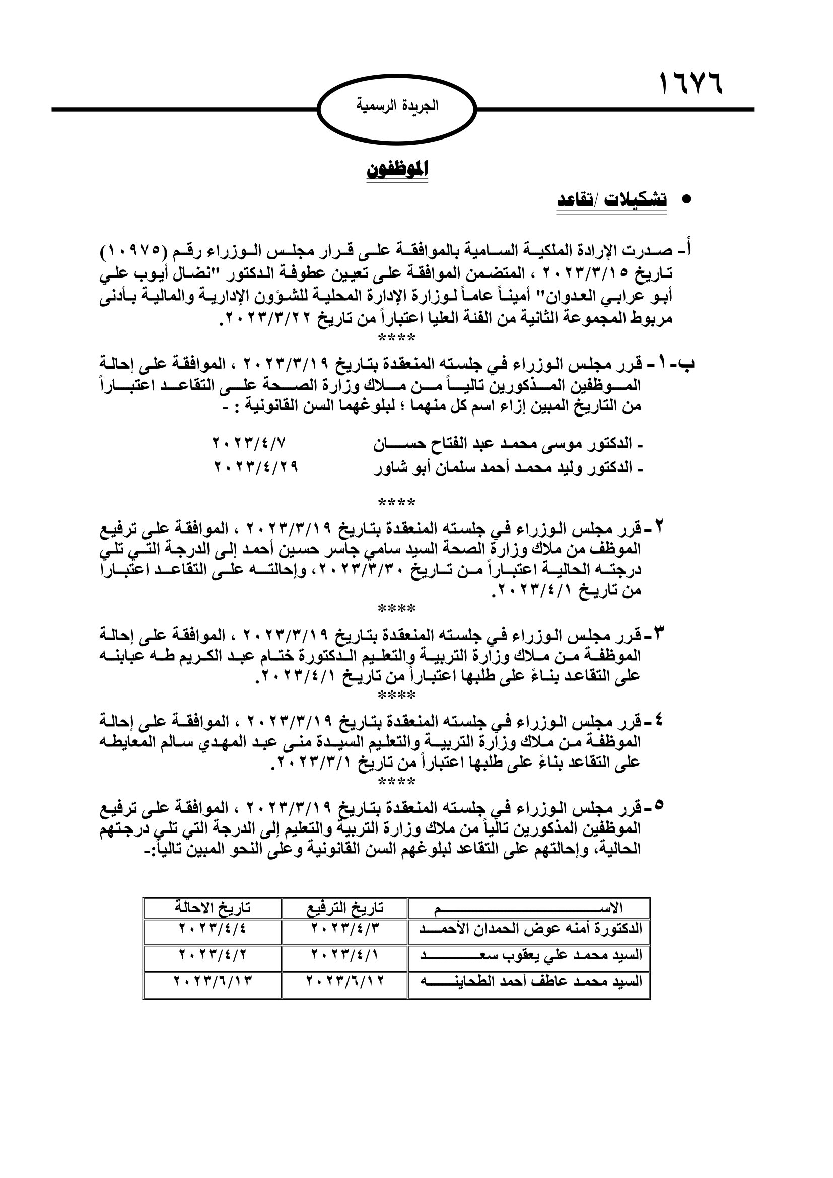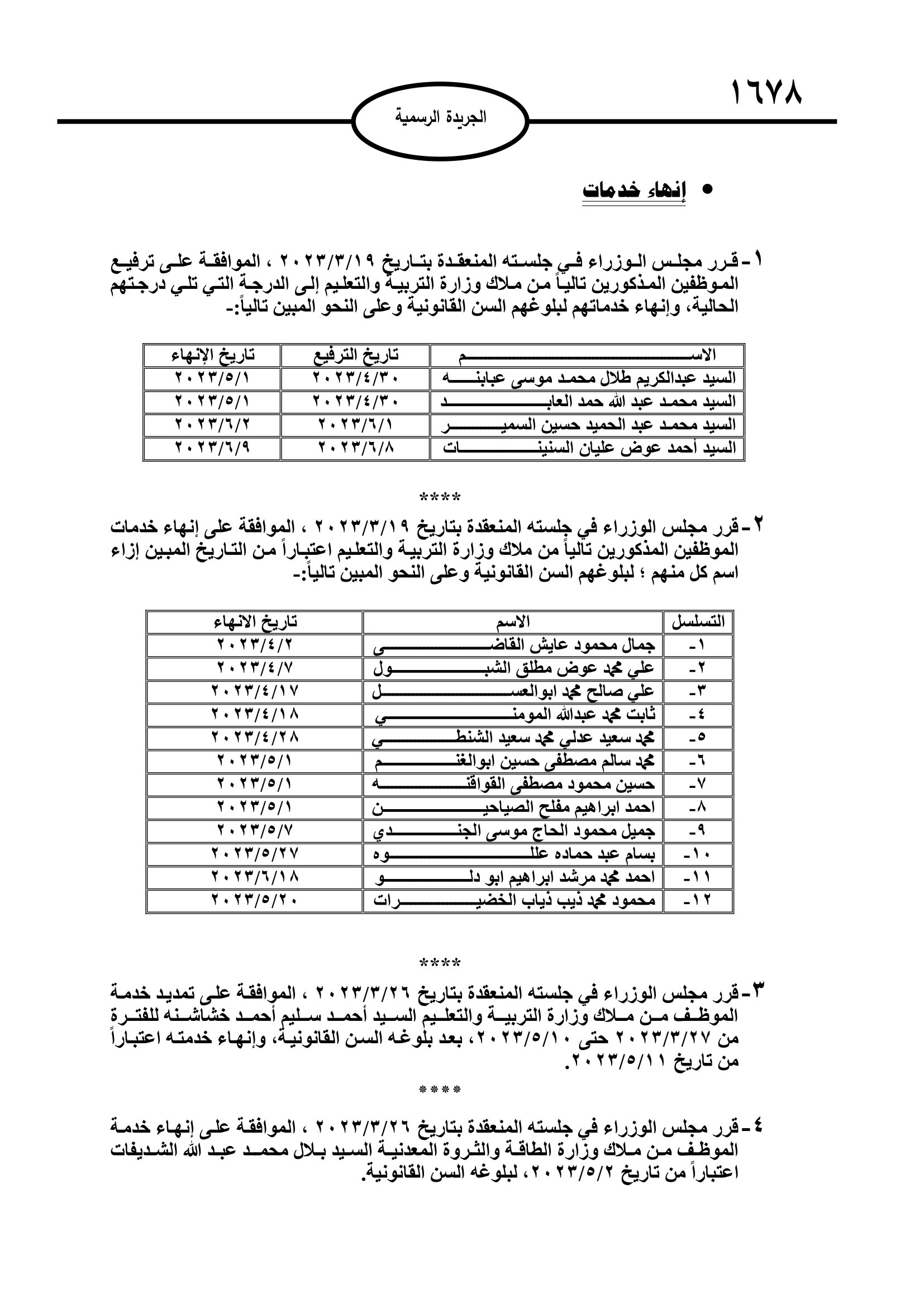صدر في عدد الجريدة الرسمية اليوم الأحد قرارات مجلس الوزراء باحالة عدد من موظفي الدولة الى التقاعد وانهاء خدمات آخرين.وتاليا الاسماء: