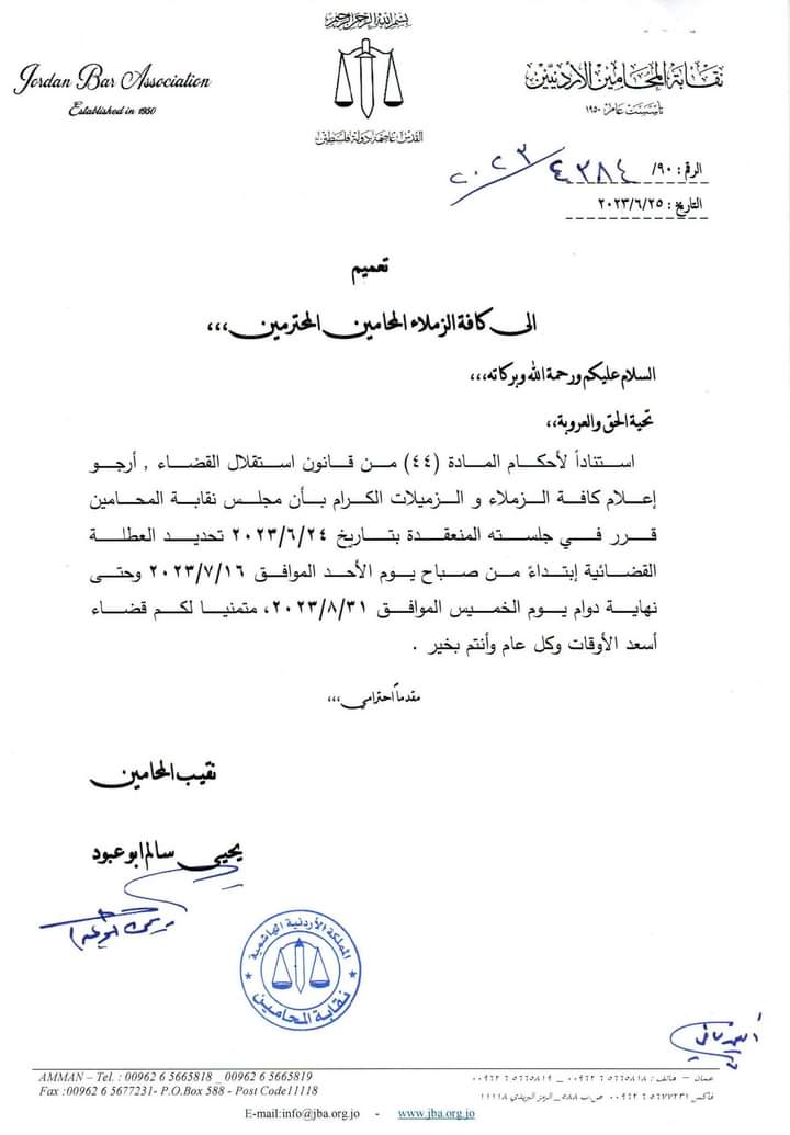![]() وكالة كل العرب الاخبارية قرر مجلس نقابة المحامين، في جلسته المنعقدة أمس السبت، بدء العطلة القضائية اعتباراً من صباح يوم الأحد 16 تموز المقبل وحتى مساء يوم الخميس 31 آب.