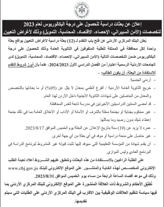 أعلن البنك المركزي الاردني اليوم الخميس عن فتح التقدم لـ12 بعثة دراسية لاغراض التعيين بواقع بعثة واحدة لكل محافظة للطلبة المتفوقين في الثانوية العامة للحصول على درجة البكالوريوس ضمن تخصصات الامن السيبراني والاحصاء والاقتصاد والمحاسبة والتمويل، وتاليا التفاصيل: