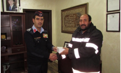 ![]() كرم مدير إدارة ترخيص السواقين والمركبات العميد خلف الخرابشة المواطن علاء محمد أحمد عودة، والمواطن ناصر درويش مصطفى سعيفان، وذلك لأمانتهما، حيث قام كل منهما بالعثور على مبالغ مالية داخل حرم إدارة الترخيص وتسليمها للإدارة التي قامت بإعادتها إلى أصحابها وفق الإجراءات القانونية المتبعة. وقال العميد الخرابشة "إن هذا التكريم يأتي بتوجيهات مباشرة من مدير الأمن العام الفريق أول الركن الدكتور توفيق حامد الطوالبة تقديرا من جهاز الأمن العام على ما بدر من هؤلاء المواطنين و الذي يعكس مواطنتهما الصالحة ويمثل نموذجا طيبا للعادات التي يتمتع بها مجتمعنا الأردني الأصيل وحافزا للجميع وليكونوا مثالا يحتذى". من جهتهما، ثمن المواطنان تلك اللفتة التي تعكس حجم التقدير من مديرية الأمن العام لدور المواطن وتعاونه في العملية الأمنية.