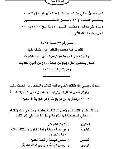 قرر مجلس الوزراء وضع نظام خاص للكلاب يحمل اسم "نظام مراقبة الكلاب والتخلص من الضالة منها والوقاية من أخطارها وترخيصها ضمن حدود البلديات " . ونشرت الجريدة الرسمية الاحد القانون وتاليا نصه :