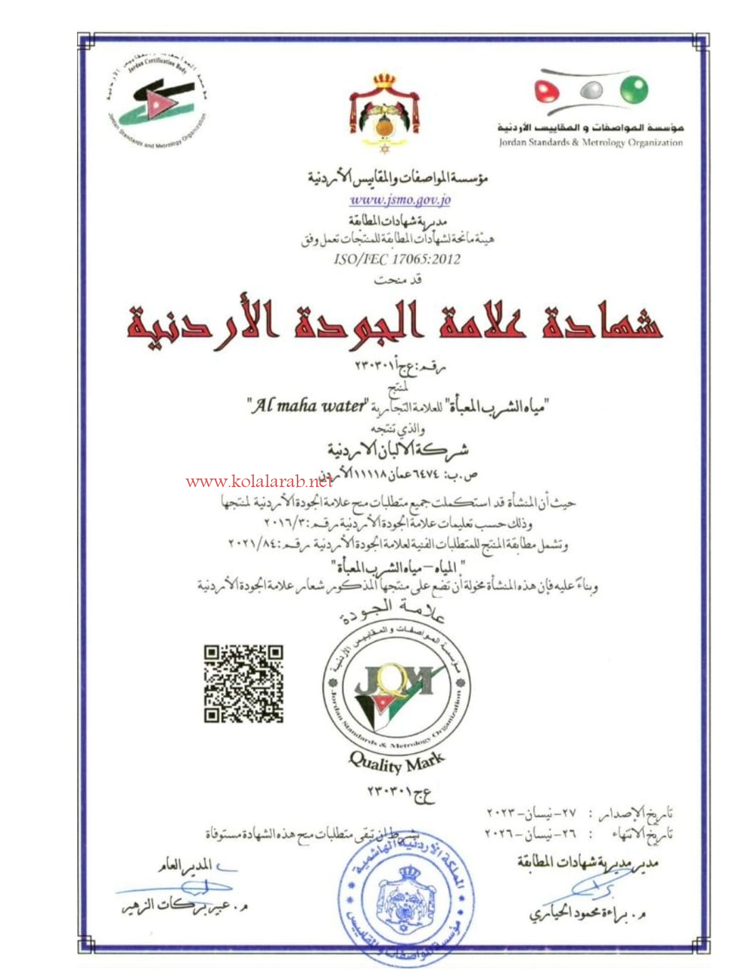 مياه الشرب المعبأة " المها " تحوز على شهادة الجودة الاردنية