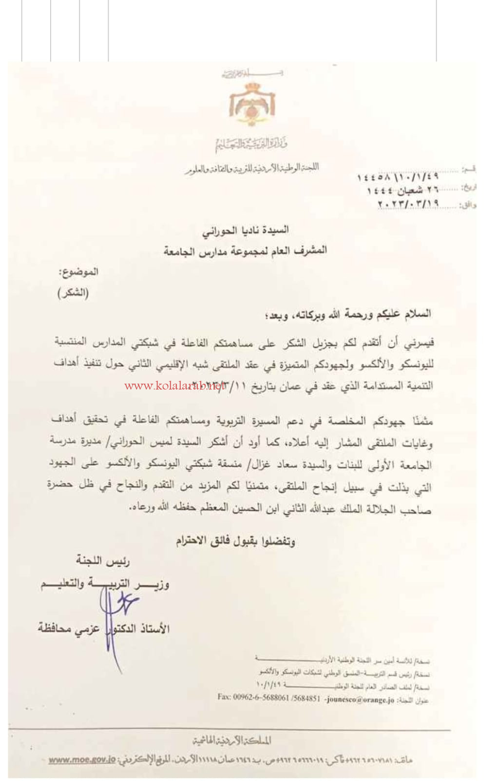 شكر من وزير التربية والتعليم لمجموعة مدارس الجامعة على انجاح ملتقى التنمية المستدامة