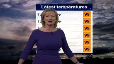 بالفيديو .. مذيعة نشرة جوية بريطانية تحاول إخفاء درجة الحرارة 99