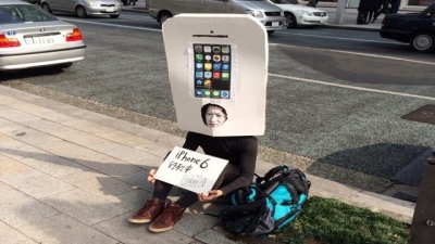 أحد عشاق "آيفون" يحجز منذ الآن دوره امام متجر بطوكيو لشراء أول هاتف "آيفون6"