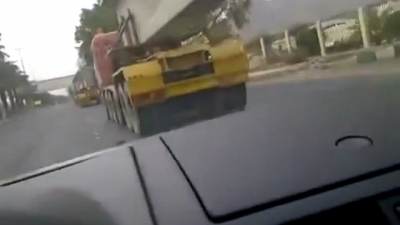 بالفيديو .. سعودي يعبر بسيارته تحت شاحنتين محملتين بصبات بناء