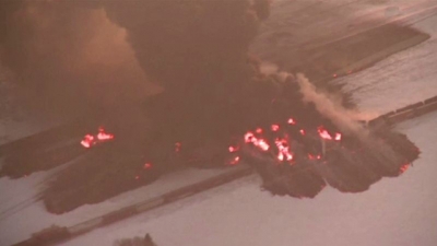 بالفيديو... نشوب حريق هائل أثر اصطدام قطارين في ولاية داكوتا الامريكية
