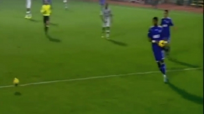 بالفيديو .. لاعب يحمل كرة قدم يلقيها في أرض الملعب بلحظة حاسمة