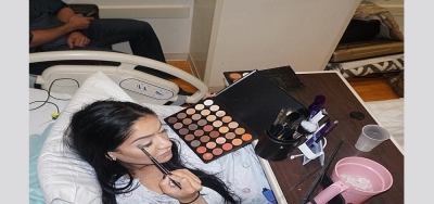 تضع الماكياج أثناء الولادة بمساعدة زوجها
