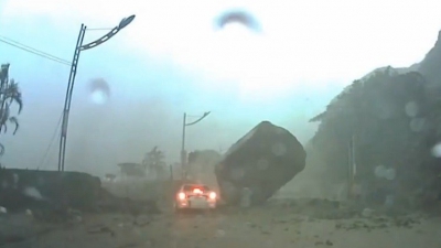 بالفيديو.. حجارة صغيرة تنقذ ركاب سيارة من صخرة عملاقة