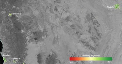 بالصور.. ناسا تنشر لأول مرة صورًا فضائية لمكة والمدينة أثناء الاحتفالات الدينية
