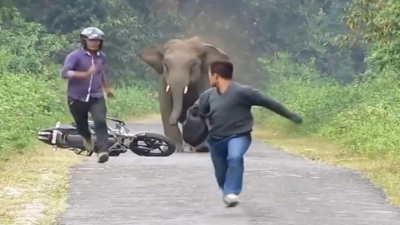 بالفيديو.. فرار شابين من فيل قاطع طريق