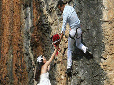 زوجان يتسلقان جبلا لالتقاط أخطر صور زفاف فى العالم