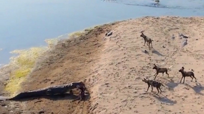 بالفيديو.. ضباع توفر خدمة دليفيري لتمساح رغما عنها