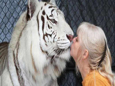 امرأة تربى نمرين فى منزلها وتنام فى أحضانهما
