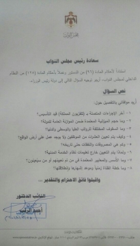 ![]() وجه النائب أحمد الرقب، سؤالا نيابيا لرئيس الوزراء هاني الملقي حول تلفزيون المملكة.
