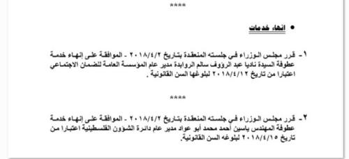 وافق مجلس الوزراء في جلسته التي عقدت بتاريخ 12/4/2018 على انهاء خدمات مدير عام مؤسسة الضمان الاجتماعي ناديا الروابدة ، وذلك لبلوغها السن القانوني (60) عاماً ، وبذلك احيلت للتقاعد اعتباراً من تاريخه.
