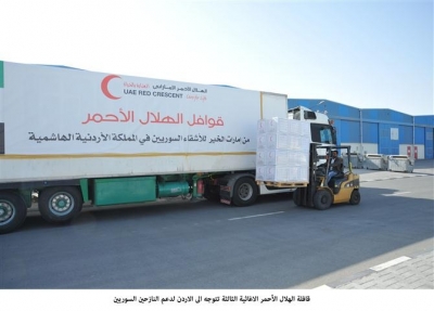 قافلة الهلال الأحمر الاماراتي الاغاثية الثالثة تتوجه الى الاردن لدعم النازحين السوريين